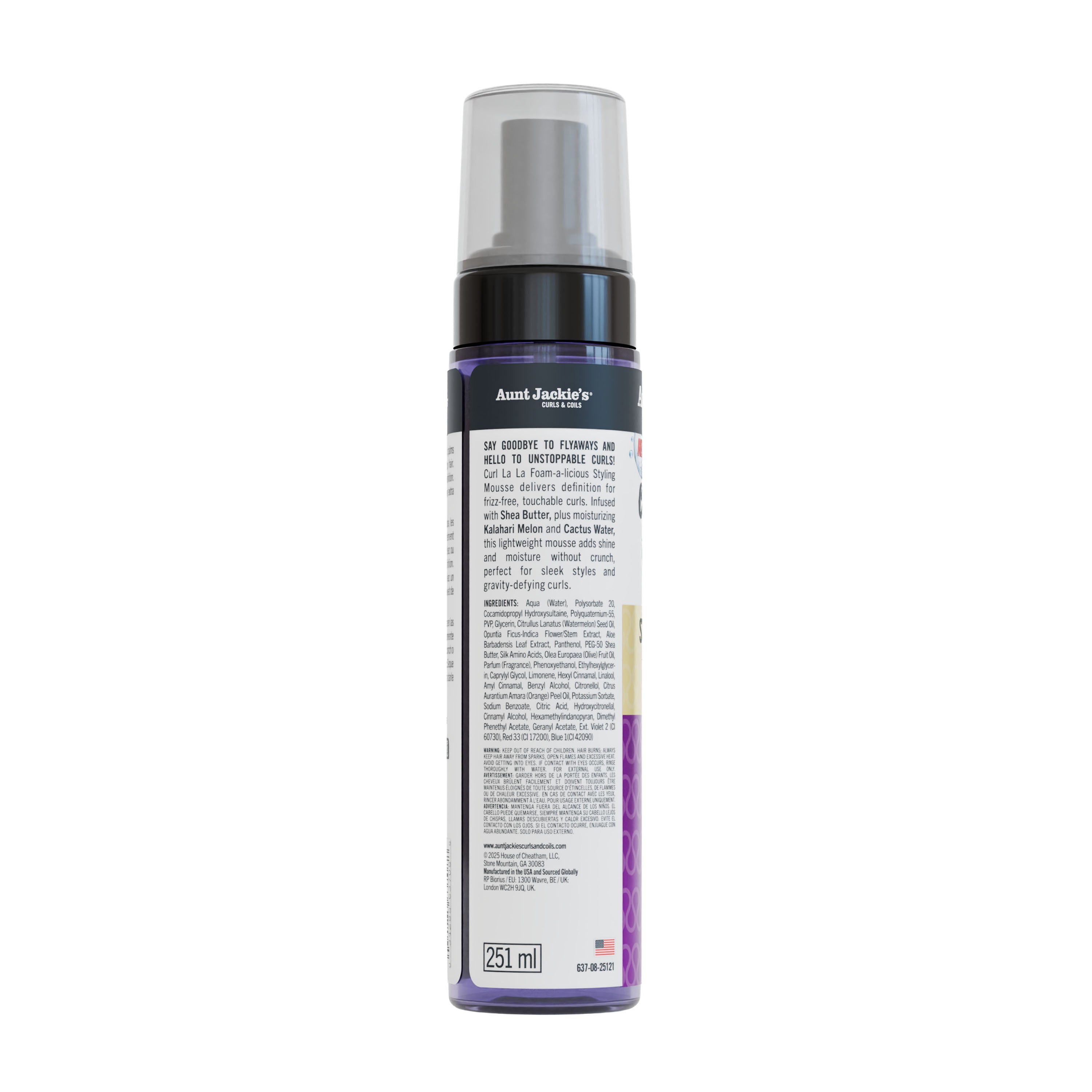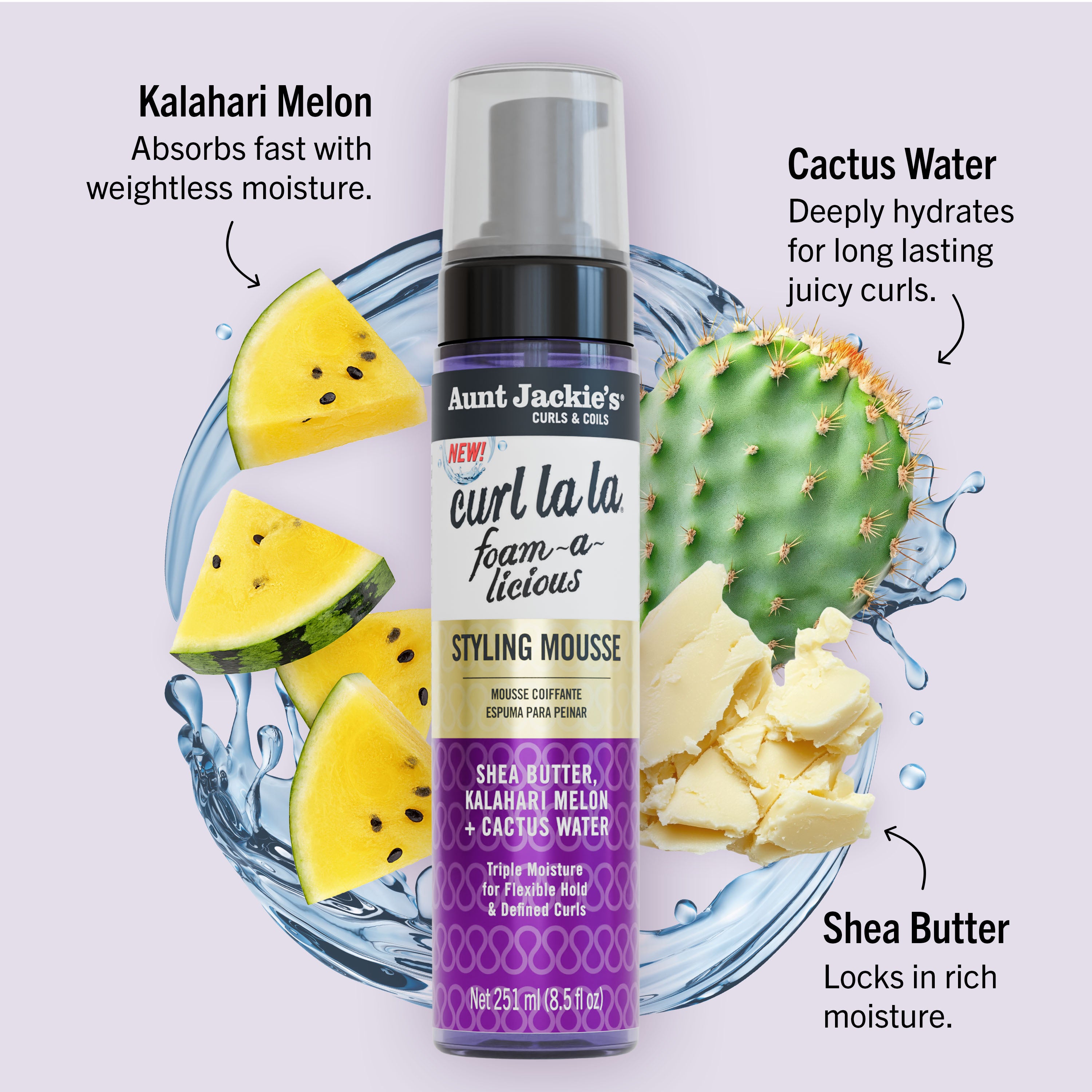 Aunt Jackie's Curls & Coils Curl La La Foam-a-licious Styling Mousse delivers soft, defined, and bouncy curls – without stiffness or frizz. This lightweight, ultra-moisturizing mousse adds shine and moisture without crunch, which is perfect for sleek styles and gravity-defying curls. It nourishes and hydrates hair with a powerful blend of Shea Butter, Kalahari Melon, and Cactus Water. Recover from thirsty, dry hair with shiny, defined curls that feel as amazing as they look! The Curl La La Collection gives your hair the hydration, the hold, and the nourishment it craves – without compromise.